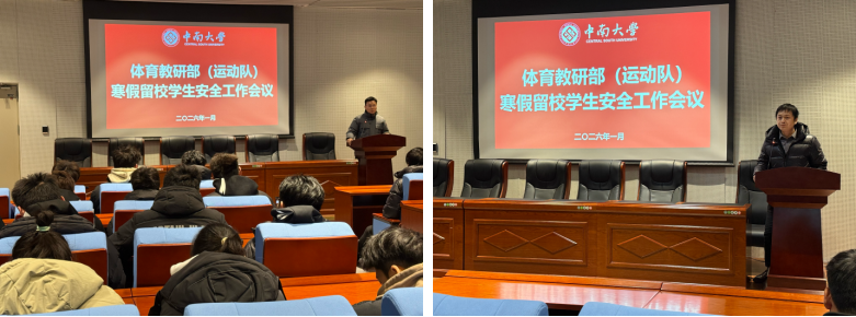 为落实学校《关于2026年寒假有关事项的通知》要求,切实做好学校寒假学生工作,确保校园安全稳定,1月29日下午,体育教研部于潇湘校区体育馆141大会议室召开寒假留校学生安全工作会议。体育教研部高思垚副主任主持会议,党委副书记王少清、学工办主任周界、高水平办主任刘兰涛、辅导员老师谢永祺,以及所有留校学生、各运动队教练员参加会议。